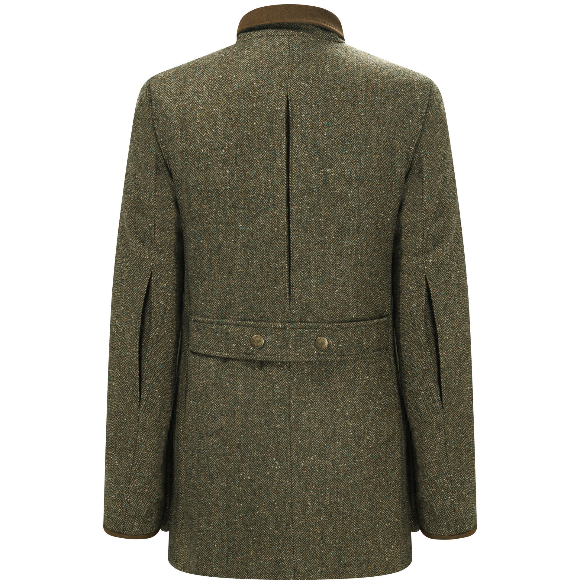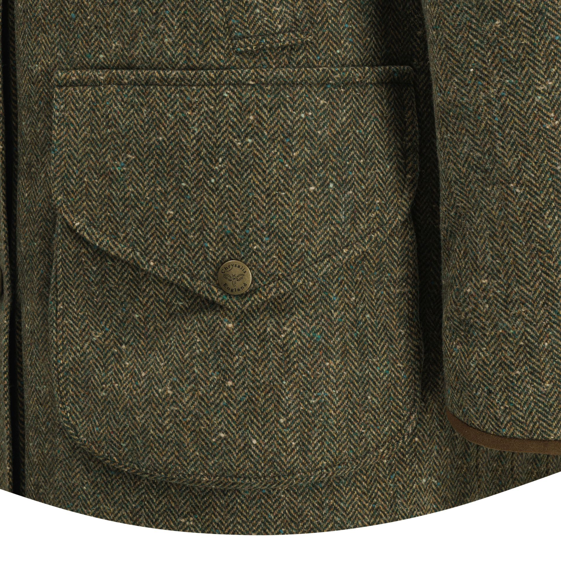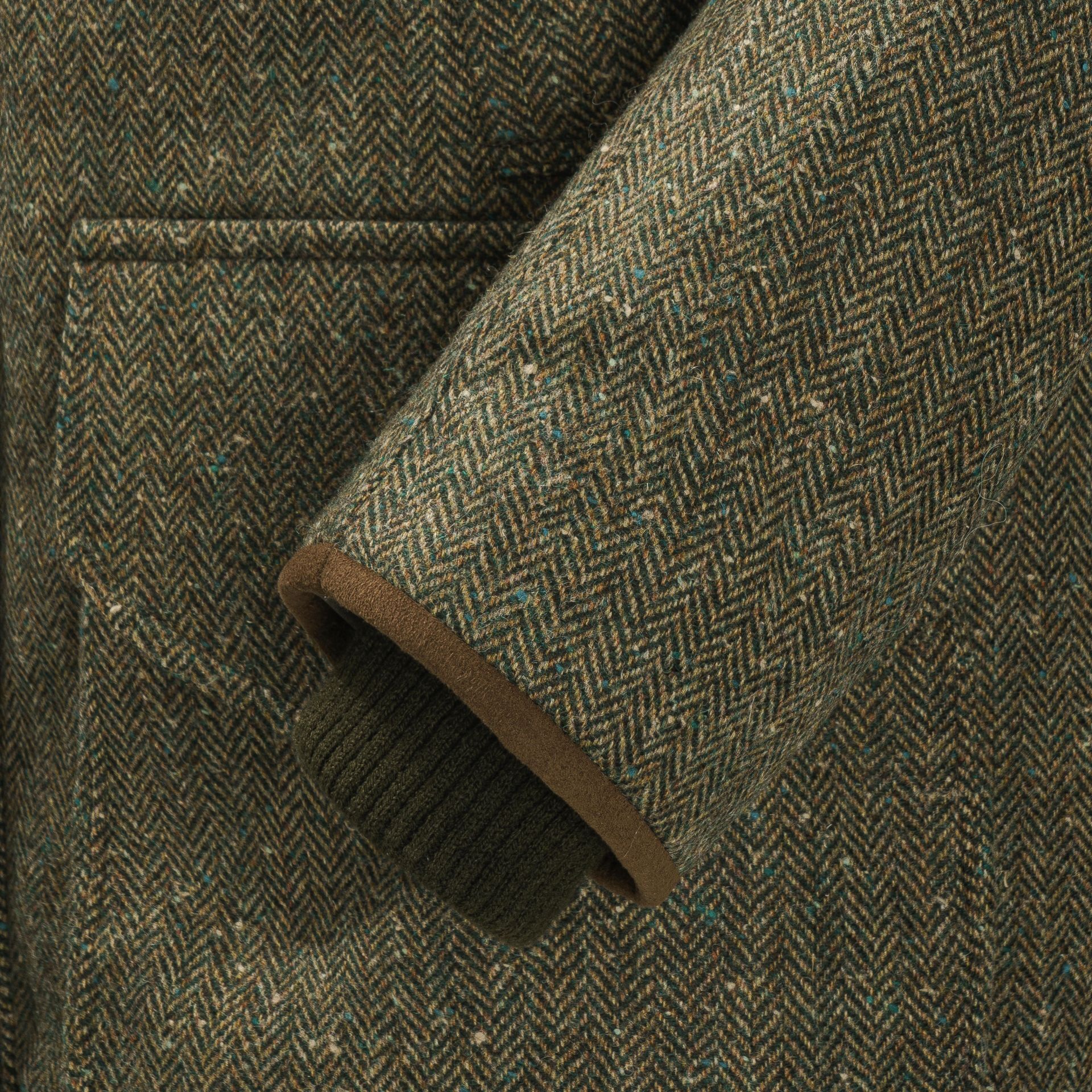 Defy even the most changeable weather with this English hunting jacket made of Scottish tweed, with a fabric developed by the Lovat weaving mill for the conditions in the Scottish Highlands. The water- and dirt-repellent Donegal tweed becomes very agile with its characteristic, subtly coloured pimples on green herringbone. In addition to the protective membrane in the collar, sleeves and torso, all seams in the shoulder and neck area are sealed, so you can withstand even the heaviest rain. Two-way brass zipper with snap-close storm flap. A wind flap with knitted cuffs on the wrist ensures a good fit. Chrysalis pays great attention to carefully crafted details. The ends of the action pleat on the back and on the sleeves are reinforced with leather-like Alcantara, as are the sleeve hems and the bellows pockets. The pocket flap can be buttoned up out of the way, in order to silently reach the contents of the pocket. The two handy slide-in pockets are lined with roughened moleskin on the inside. A back belt is attached at waist height. The jacket is rounded off by a quilted polyester lining with two inside pockets.