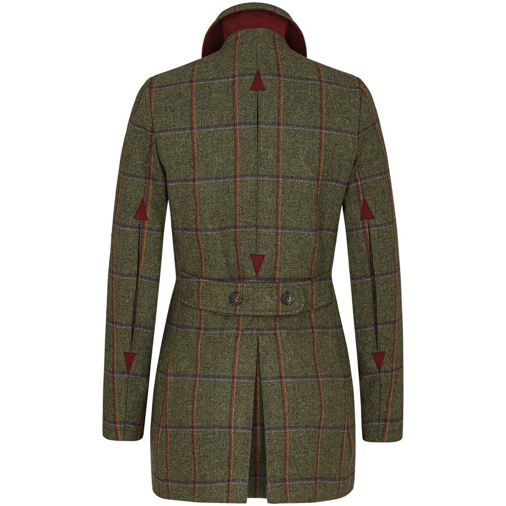 The elegant »Bloomsbury« ladies' jacket is characterised by exclusive workmanship and first-class wearing comfort. It is made of fine English tweed fabric. Attractive and unusual details such as the slits on the sleeves and in the back, the red felt collar, the slanted piped billet and flap pockets, the adjustable strap in the back and the body-hugging cut skilfully complete the elegantly feminine design. The jacket closes with a zipper and a button placket. The first-class workmanship and the elegant look make the jacket a stylish companion – whether on the hunt or as casual leisurewear.