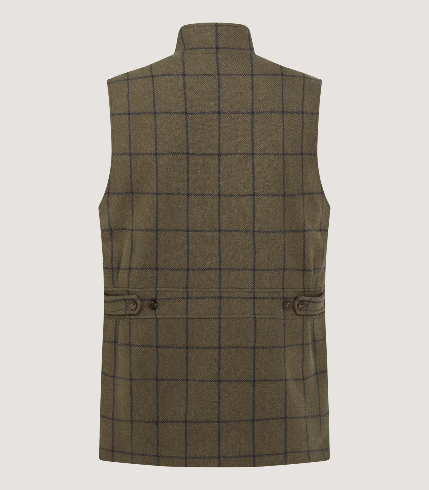 This sporting vest has a blended Scottish wool and cashmere tweed for both warmth and durability. The high collar has a traditional shape with a throat latch. The anti-slip patches on the shoulders add extra protection while the adjustable tabs on the back gather the shape.