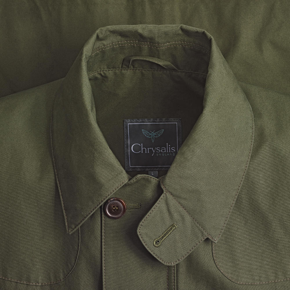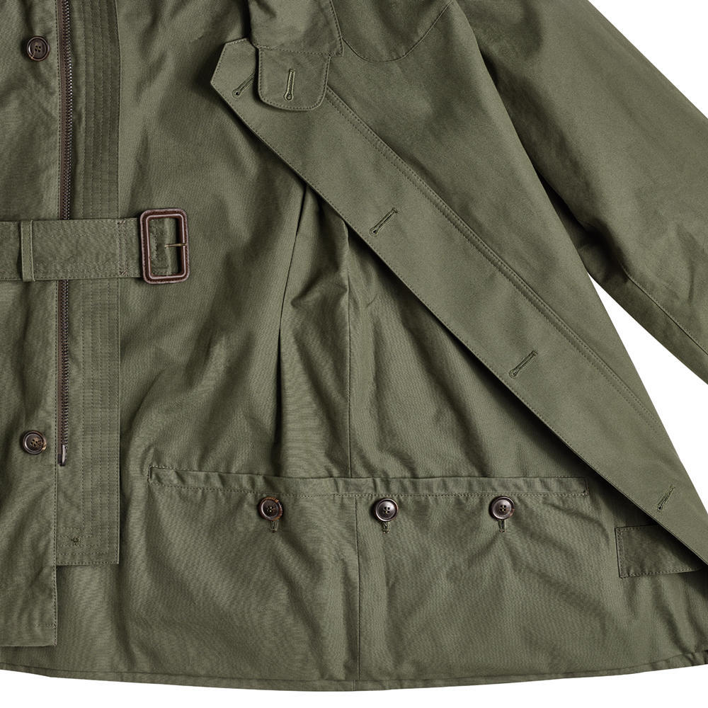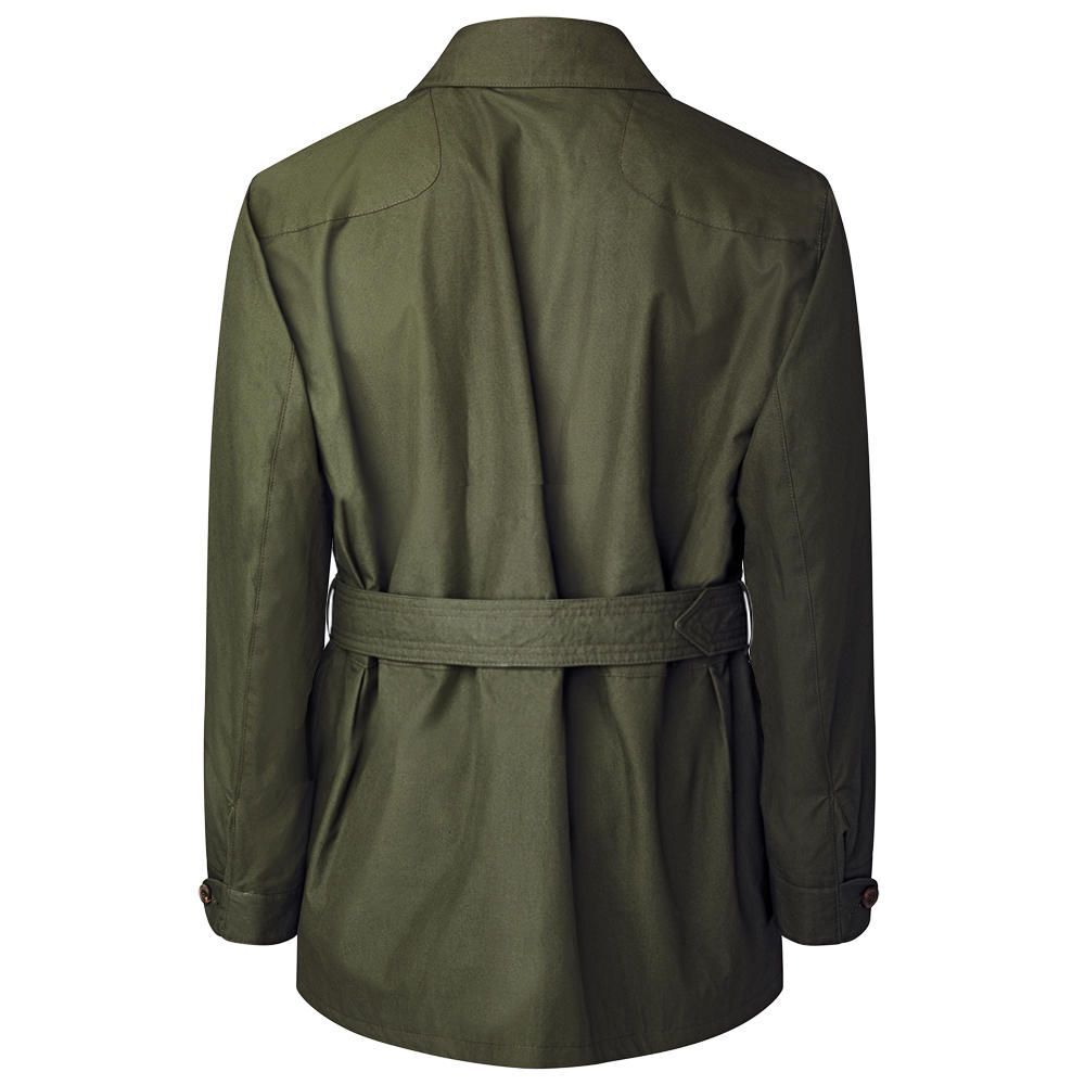 Made from a luxurious waxed cotton fabric crafted on the British Isles, this jacket combines functionality and style. Whether out in the countryside or in the city, it offers warmth and protection, as it is fully equipped with the same breathable material on the inside as on the outside. When the collar is turned up, it can be closed with a throat tab. Wide patches reinforce the shoulders. Lateral action pleats in the shoulder area provide freedom of movement and special wearing comfort. The square bellows pockets with flaps have a slide-in pocket front left. Like a game bag, a large inside pocket extends across the entire width of the back. If you wear the jacket without the belt with leather buckle, the fixed back belt comes to the fore. Buttoned cuffs.