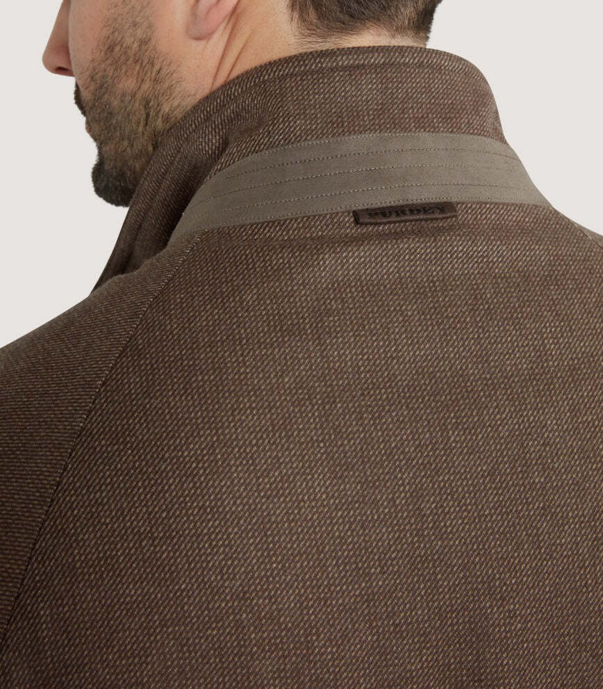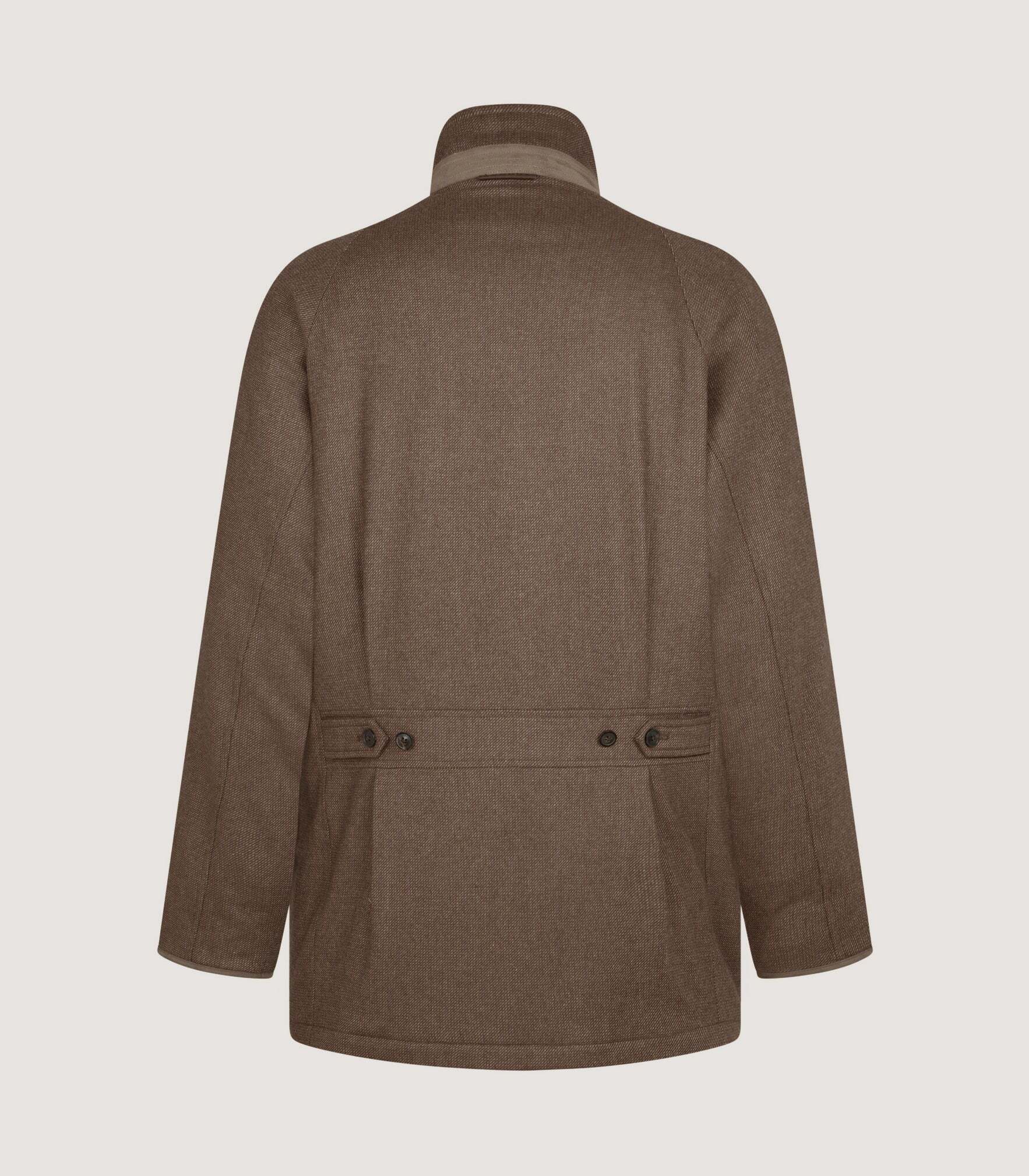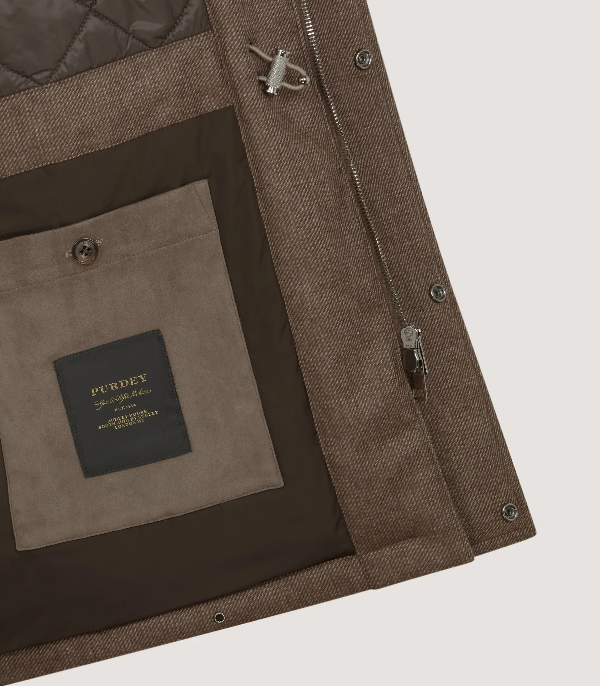 The Purdey Field Coat, expertly crafted in Italy from a luxurious Scottish tweed blend of 90% wool and 10% cashmere in our distinctive Percy colourway. This refined adaptation of our iconic design features a Sympatex drop liner membrane and HD wool wadding, ensuring exceptional warmth on even the chilliest winter days. The quilted lining and sleeves add a further layer of comfort, while the capacious internal stow pocket, zipped security pocket, and practical cartridge pockets provide ample storage. Note the concealed snap front storm placket, robust front zip closure, elegant horn buttons, and fleece-lined hand warmer pockets complete with retainer straps. The leather Purdey embossed tab, clarino collar stand, and merino knitted inner cuffs provide subtle finishing touches. Cut for a relaxed fit, this coat is a considered addition to any field wardrobe.